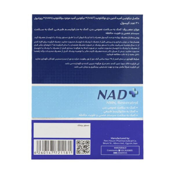 ان آ دی پلاس نوتراکس یک مکمل حاوی نیکوتین آمید آدنین دی نوکلئوتید، نیکوتین آمید مونو نوکلئوتید و رزوراترول بوده که به بهبود عملکرد نورونهای مغزی، سلامت سیستم عصبی و تقویت حافظه کمک میکند. در این محصول به میزان مشخصی از ماده موثره نیکوتین آمید آدنین دی نوکلئوتید، نیکوتین آمید مونو نوکلئوتید و رزوراترول وجود دارد که سبب کمک به بهبود فعالیتهای مختلف بدن که با افزایش سن با کاهش عملکرد مواجه هستند، میشود. مصرف این مکمل به کاهش سرعت روند پیری و افزایش متابولیسم و انرژی سلولی کمک شایانی میکند. علاوه بر این، خاصیت قدرتمند آنتی اکسیدانی آن موجب ترمیم ماده ژنتیکی و کند کردن روند پیری میشود.